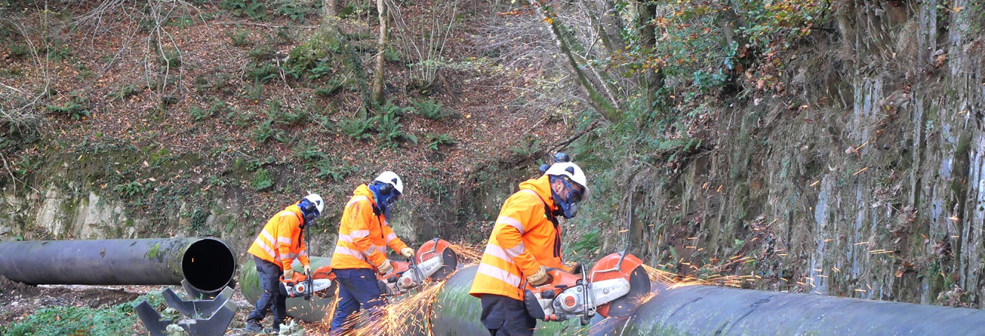 Depuis le 22 septembre, la conduite Ø900 de la CAEB a été mise à l’arrêt puis vidangée, permettant le lancement du chantier. Les équipes ont ainsi pu procéder à la dépose de la canalisation existante en tronçon de 6,5 m. Les segments retirés, préalablement aplatis, sont acheminés vers un centre de recyclage des métaux.